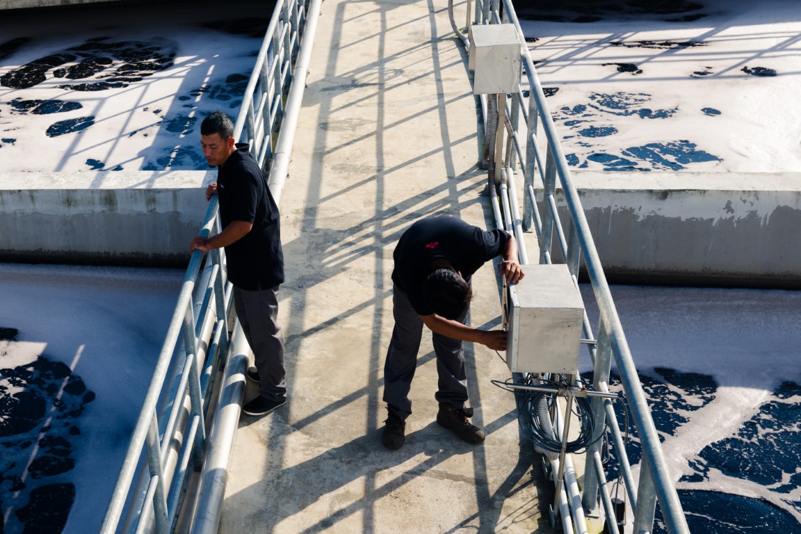 Teknologi mikroskop juga digunakan untuk memastikan kualitas bakteri dalam sistem tetap optimal.